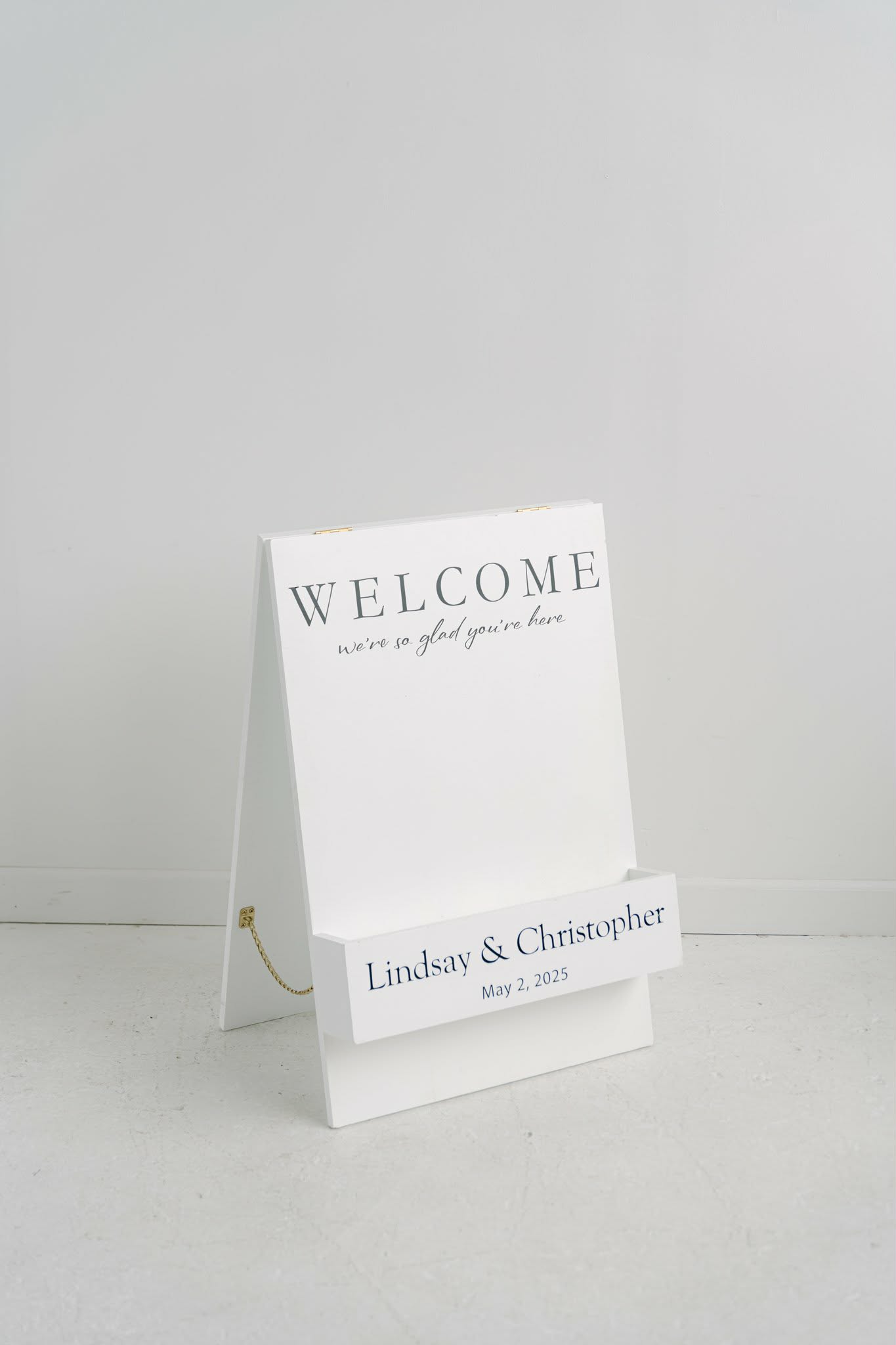 White wooden stand-up sign which can be customized for an additional fee with vinyl lettering (see image gallery for examples). Add flowers to the box on the front for a cute addition to any wedding or event.